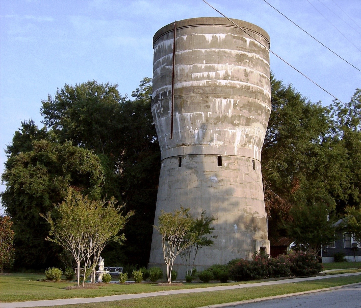 This massive 1918 water tower is constructed of cast-in-place concrete. Located near the railroad, it provided water for the steam locomotives on the Central of Georgia Railroad in the 1930s.